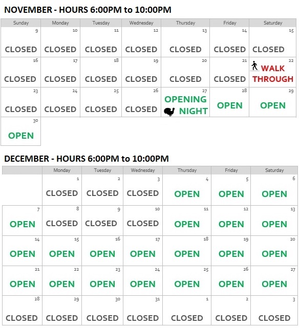 Want to meet and greet Santa Claus? It is always the Christmas season where people of all ages love to meet Santa Claus! This year, we will have Santa Claus there every night that we are open from Thanksgiving Night through Tuesday 12/23/2025. Cost is $25 for a photo with Santa. Please have a look at our calendar to see which days we are open during the 2025 season.